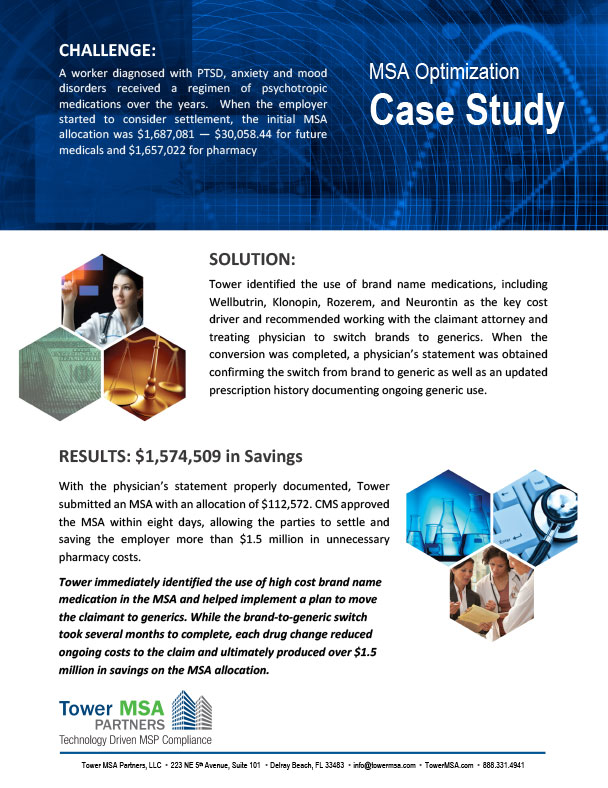 In addition to the states that have already implemented closed formularies or are in the process of doing so, several others are considering the idea. The result could be better efficiencies and significant savings for Tower MSA Partners’ clients in managing workers’ compensation claims even before the Medicare Set Aside review and triage process.